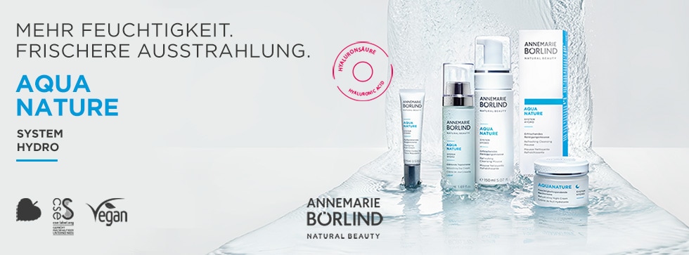 Der „Zauberwirkstoff“ heißt ganz klar: Hyaluronsäure. Dieser Rohstoff ist in jugendlicher und frischer Haut überreich zu finden. Er besitzt die Fähigkeit, Wasser zu binden. Die Haut ist ausreichend aufgepolstert und Fältchen haben so keine Chance, sich einzulagern. Mit zunehmender Reife und/oder durch Umwelteinflüsse und Stress nimmt der Gehalt an Hyaluronsäure ab und die Haut verliert Flüssigkeit. Mit einer einfachen Feuchtigkeitspflege ist es in diesem Falle nicht mehr getan, da die Haut nicht in der Lage ist, die Feuchtigkeit auch zu speichern. Der Firmenphilosophie entsprechend wird die Hyaluronsäure der Produkte von ANNEMARIE BÖRLIND zu 100 % aus Pflanzen gewonnen. Neben einem erfrischenden Reinigungsmousse beinhaltet die Aquanature – Serie eine Feuchtigkeitscreme, eine Feuchtigkeitsmaske, sowie ein hochwirksames Serum. Ein treuer Begleiter durch alle Situationen des Alltags ist das Aquanature 24 h Sorbet. Am Morgen aufgetragen erfrischt und schützt es die Haut während des gesamten Tages und versorgt sie auch noch in der Nacht während der Regenerationsphase mit ausreichend Feuchtigkeit. Dazu ist es sehr ergiebig und duftet angenehm maritim.