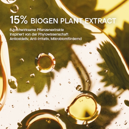Stimuliere deine hauteigenen Regenerations- und Verjüngungsprozesse mit den entzündungshemmenden, antioxidativen, anti-irritativen und mikrobiomfördernden Eigenschaften des BIOGEN PLANT EXTRACT.