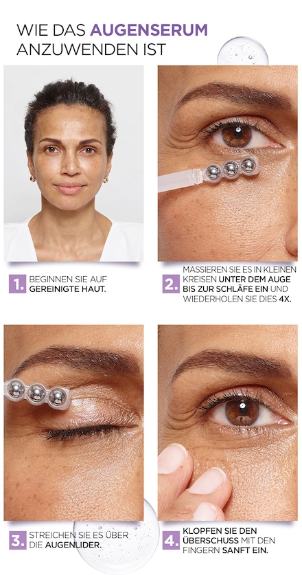 Das L'Oréal Paris Revitalift Filler Augenserum ist mit einem speziellen Kugel-Applikator versehen, mit dessen Hilfe es sich einfach und präzise auftragen lässt. Darüber hinaus massiert der Applikator direkt beim Auftragen die Augenpartie und bietet einen angenehm kühlenden Effekt. Zudem regt die Massage die Durchblutung der Haut an. Nach etwa 2-wöchiger Anwendung des Serums werden Augenfältchen und dunkle Augenringe deutlich gemildert, nach 6 Wochen erhält die Haut zusätzliche Festigkeit. Wenden Sie das Serum täglich morgens und abends auf der zuvor gereinigten Augenpartie an.