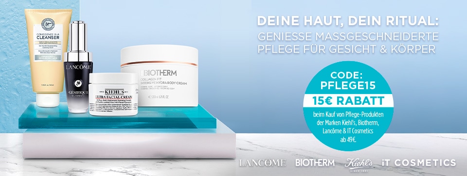 Sichere Dir 15€ RABATT mit der Code PFLEGE15 beim Kauf von Pflege-Produkten der Marken Kiehl´s, Lancôme, Biotherm, iT Cosmetics
